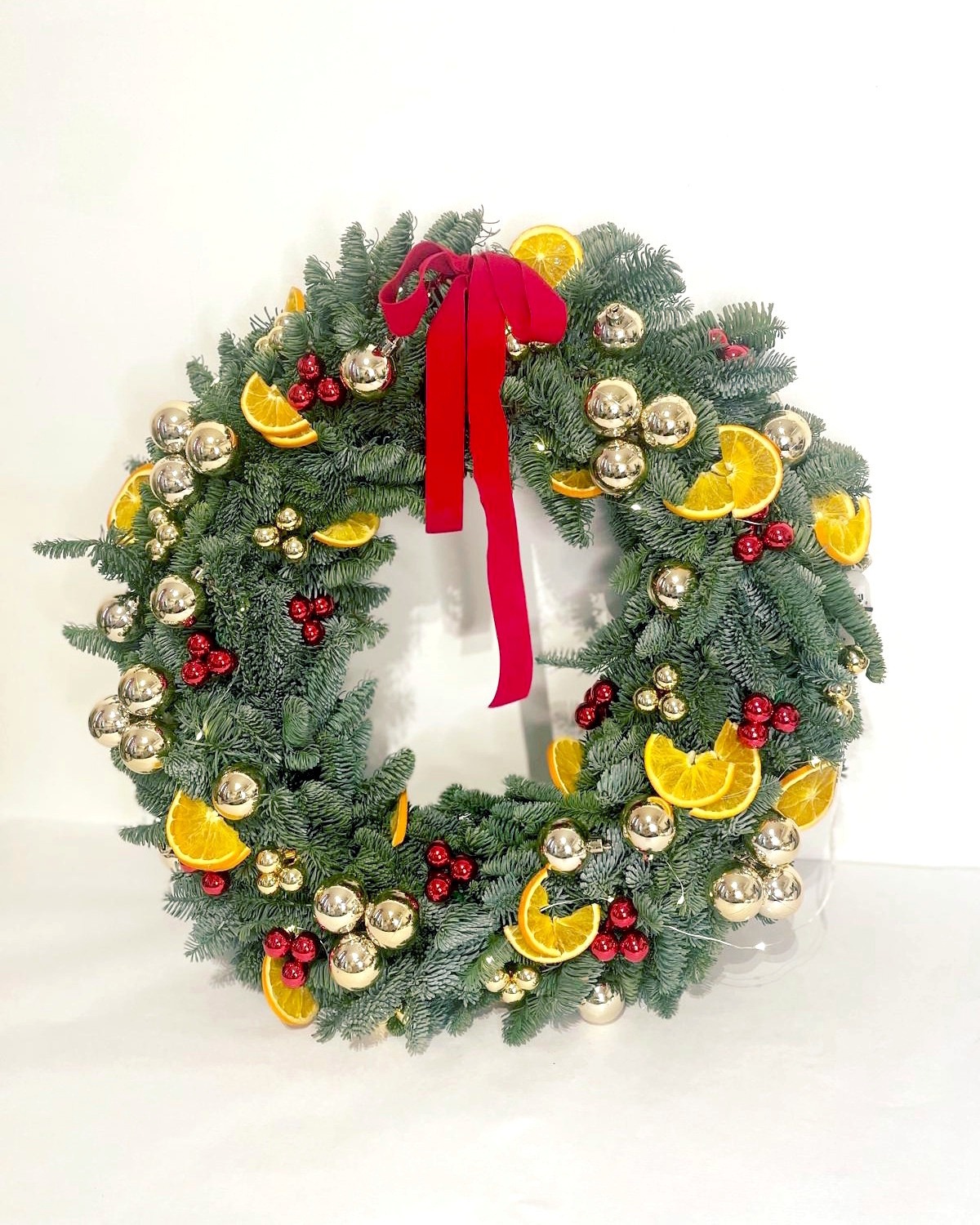 La couronne Metz évoque les marchés de Noël traditionnel par ses boules de Noël, ses petites pommes de pin et ses éléments gourmands : bâtons de cannelle, tranches de pommes et d’oranges pour un éveil des sens.