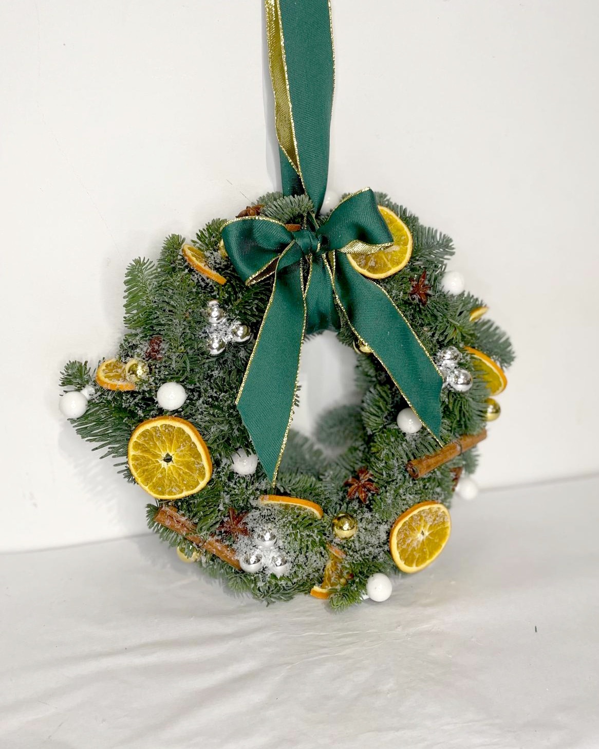 Couronne de sapin naturel à suspendre, ornée de diverses décorations de Noël, dans les tons blancs et or / argent.