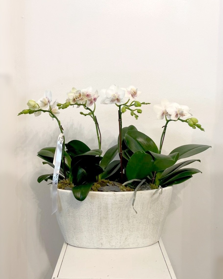 Composition d’orchidées comprenant 4 tiges d’orchidées Phalaenopsis blanches variété « mini » dans sa coupe en céramique de forme bateau.