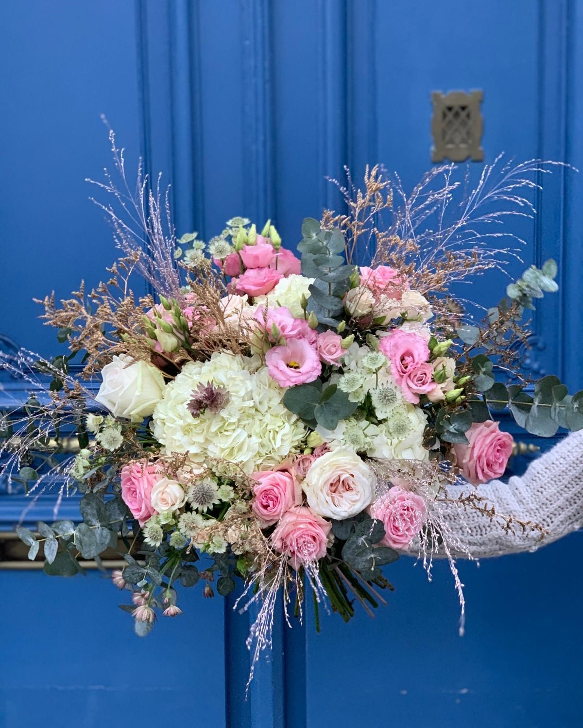 Il est ici composé d’hortensia, de lisianthus, de roses, fleurettes métalissées, agrémenté d’un feuillage de saison